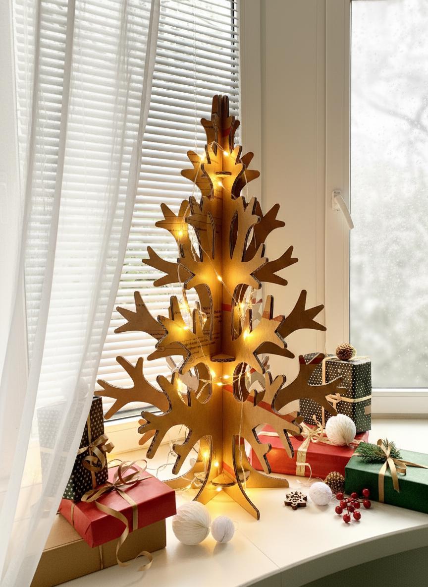 🌲 Unique Character: Each tree is made from pre-used recycled cardboard containers, meaning some parts may feature printed text, symbols, or part of a white sticker on one side of the detail—adding to the unique, eco-conscious charm of your tree.